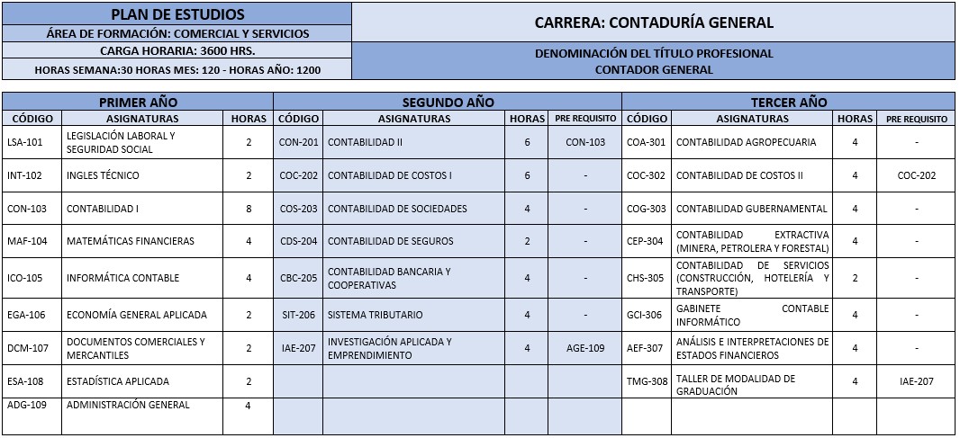 Formar profesionales en Contaduría General, líderes, emprendedores con alto espíritu de superación, capaz de responder a las exigencias del mercado laboral, en el desempeño de sus funciones, en los sectores económicos primario (extractivas y productivas), secundario (comerciales) y terciario (servicios) en la grande, mediana y pequeña empresa, con reciprocidad, complementariedad, productividad; preparando y evaluando los estados financieros de empresas públicas y privadas.